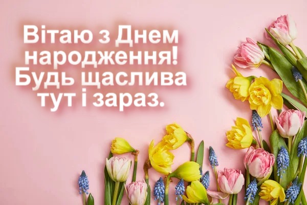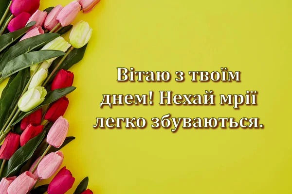 Вітаю з днем народження. Бажано, щоб у тебе завжди залишалась та легка іскра в очах, яка з’являється, коли все на своєму місці. Нехай її підтримують хороше самопочуття, внутрішня свобода, любов до себе і радість бути саме такою, якою ти є.